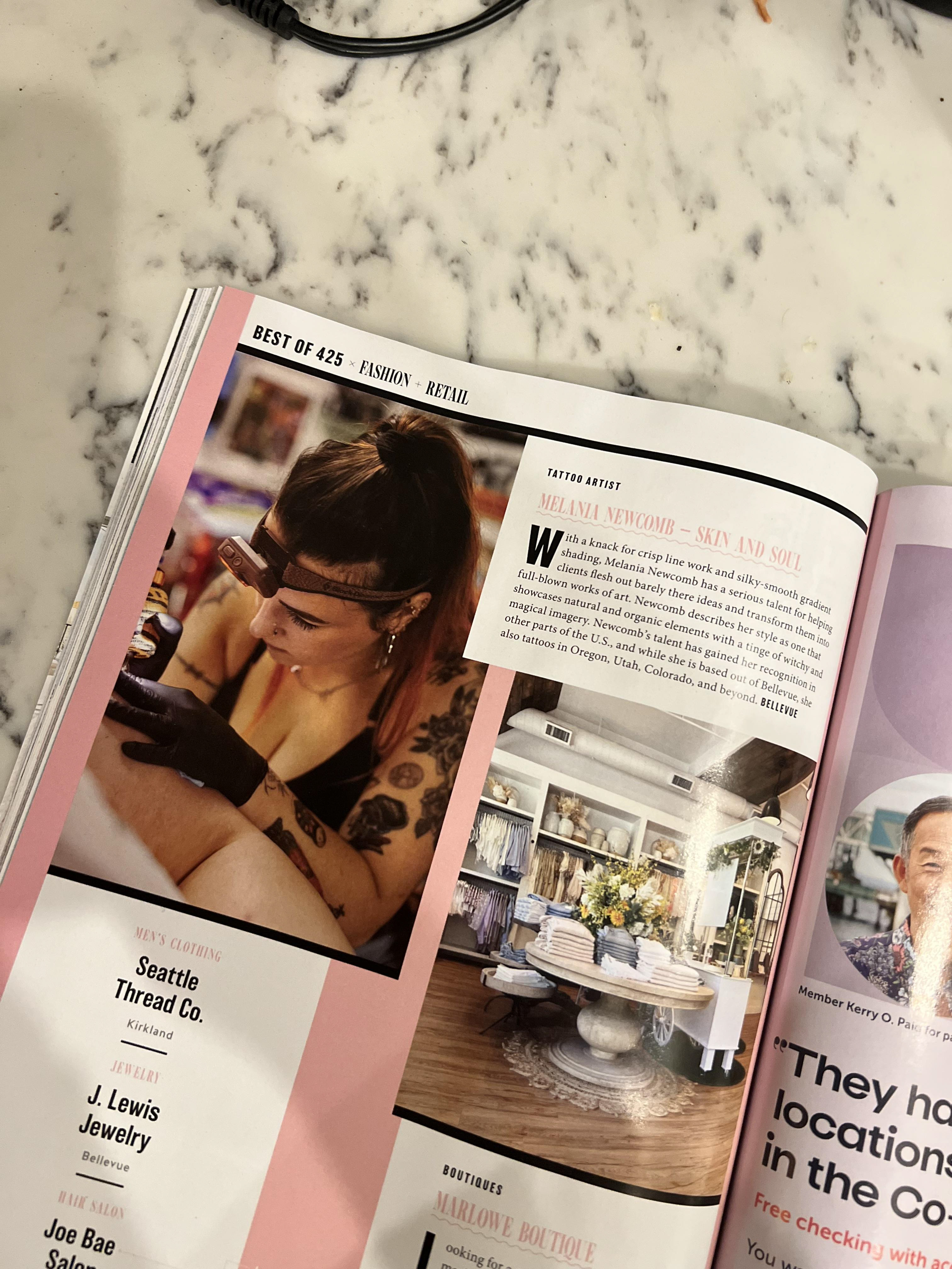 Melania is a technically advanced tattoo artist in Bellevue Washington. Specializing in fine-line and illustrative tattooing, Melania can bring your ideas to life with custom designs. Her tattoo style showcases nature & organic elements - with her flare of witchy and magical imagery