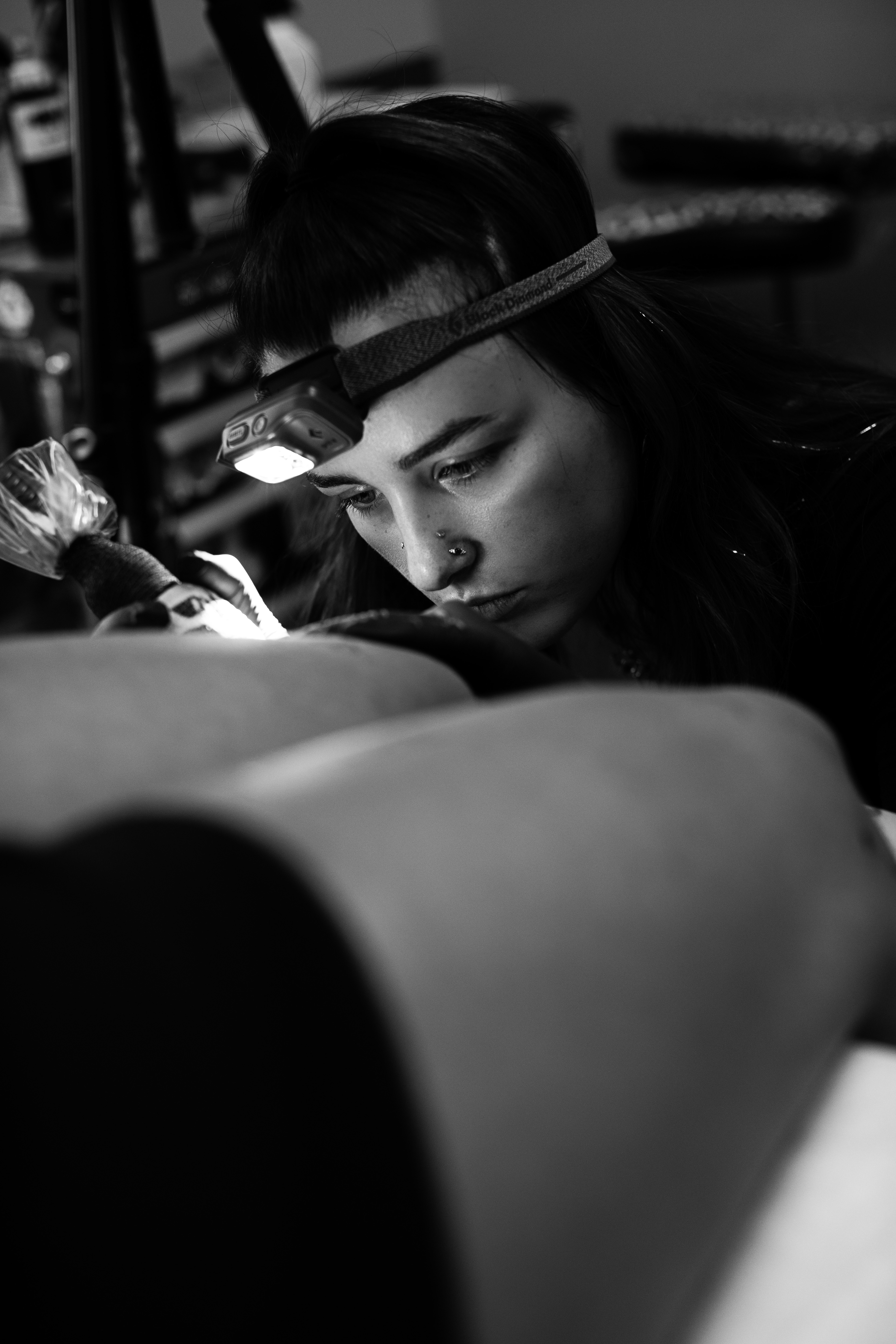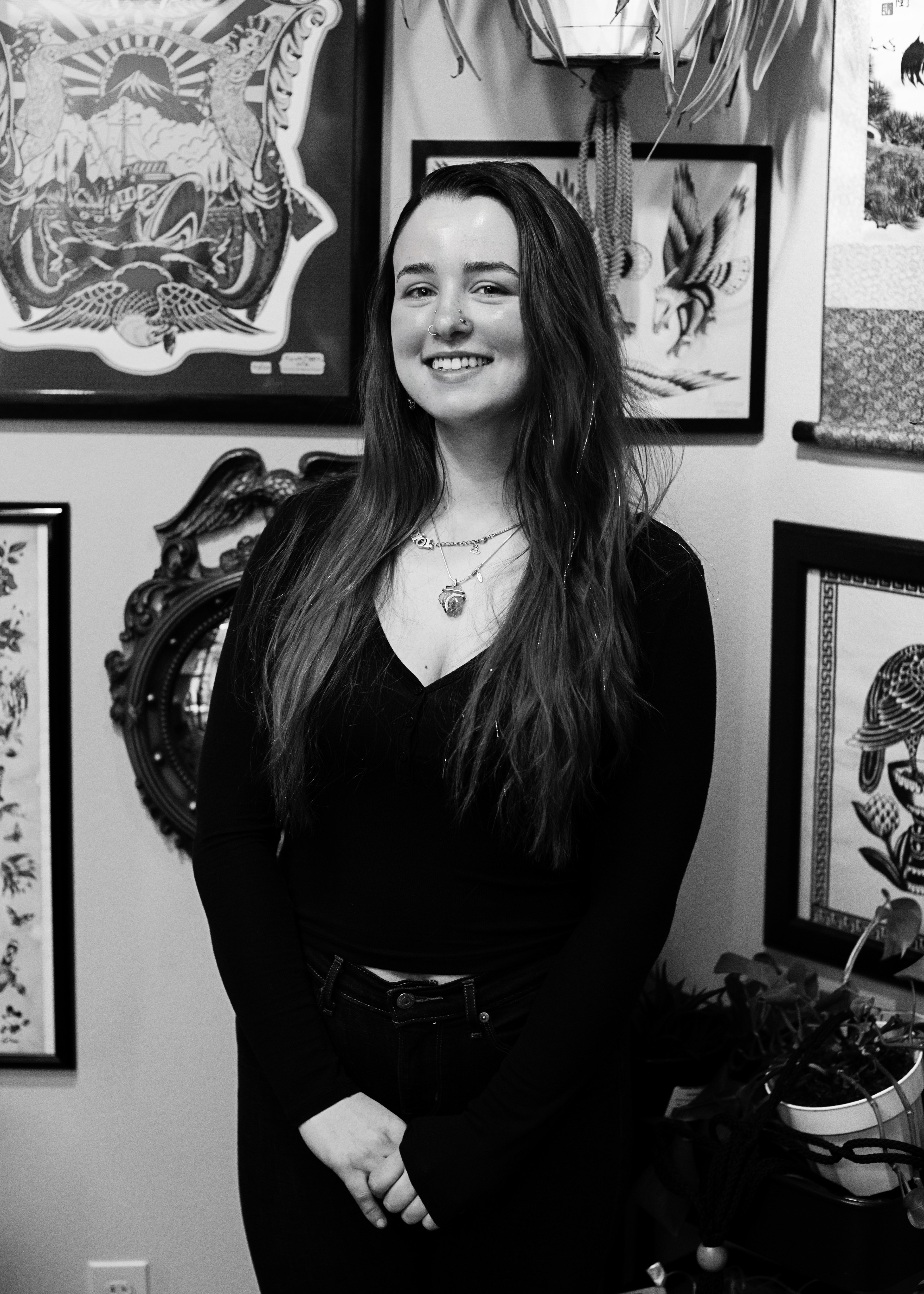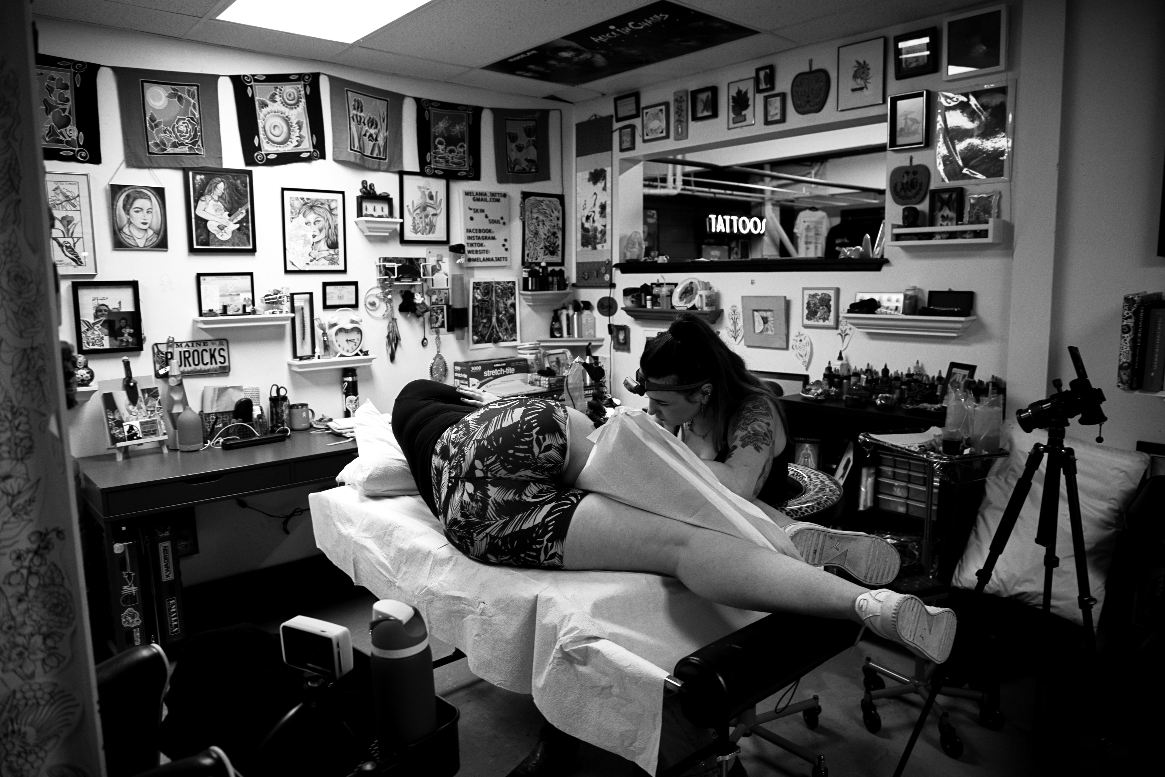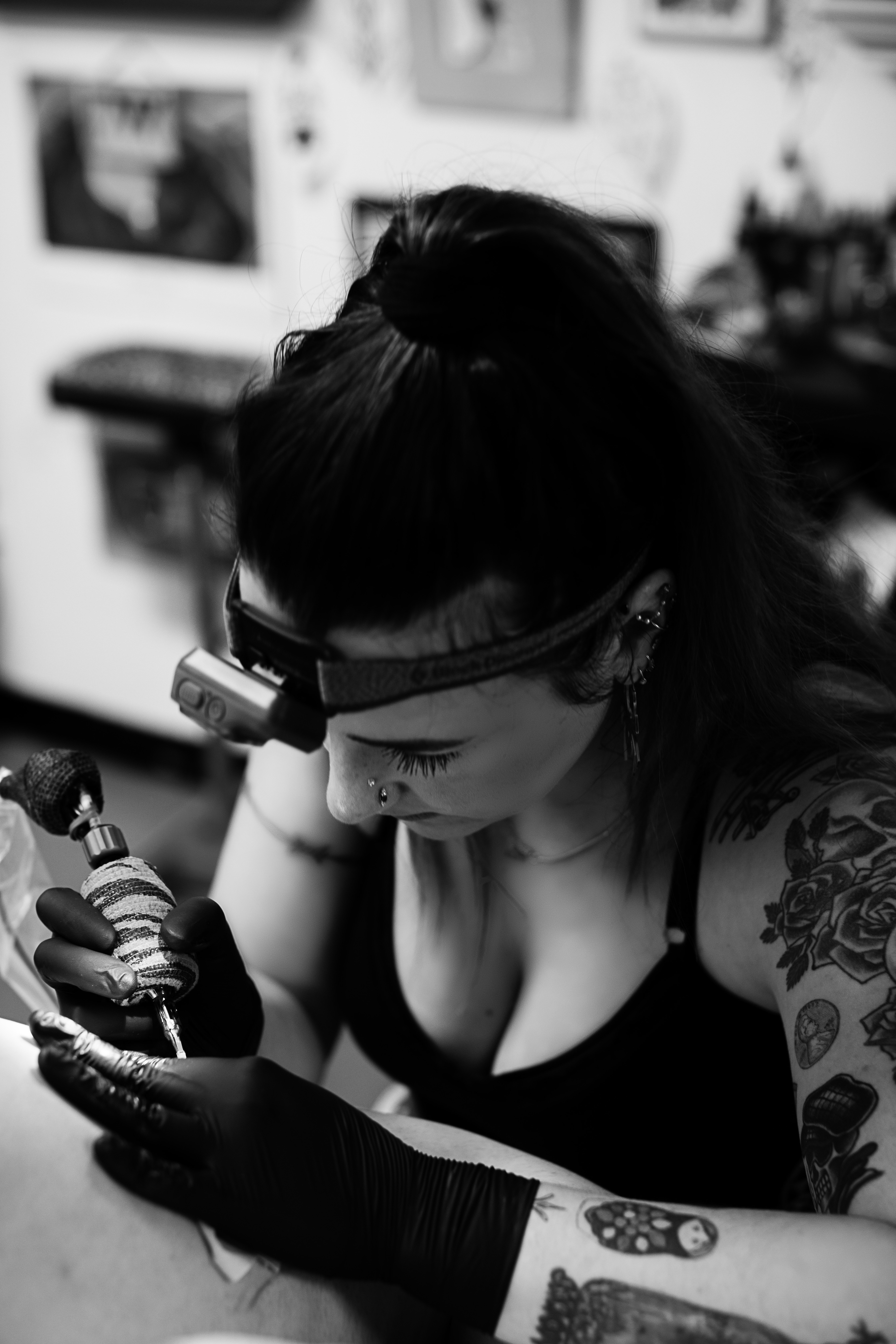 Mel has a knack for clean linework, and smooth gradient shading. Her work includes unique pops of white highlights, clever design choices, and intentional placement. She is proficient in working with color or black and gray, and can translate your tattoo dreams into a technically beautiful tattoo that looks - and heals great on any skin type. Medium to larger pieces are preferred for booking.